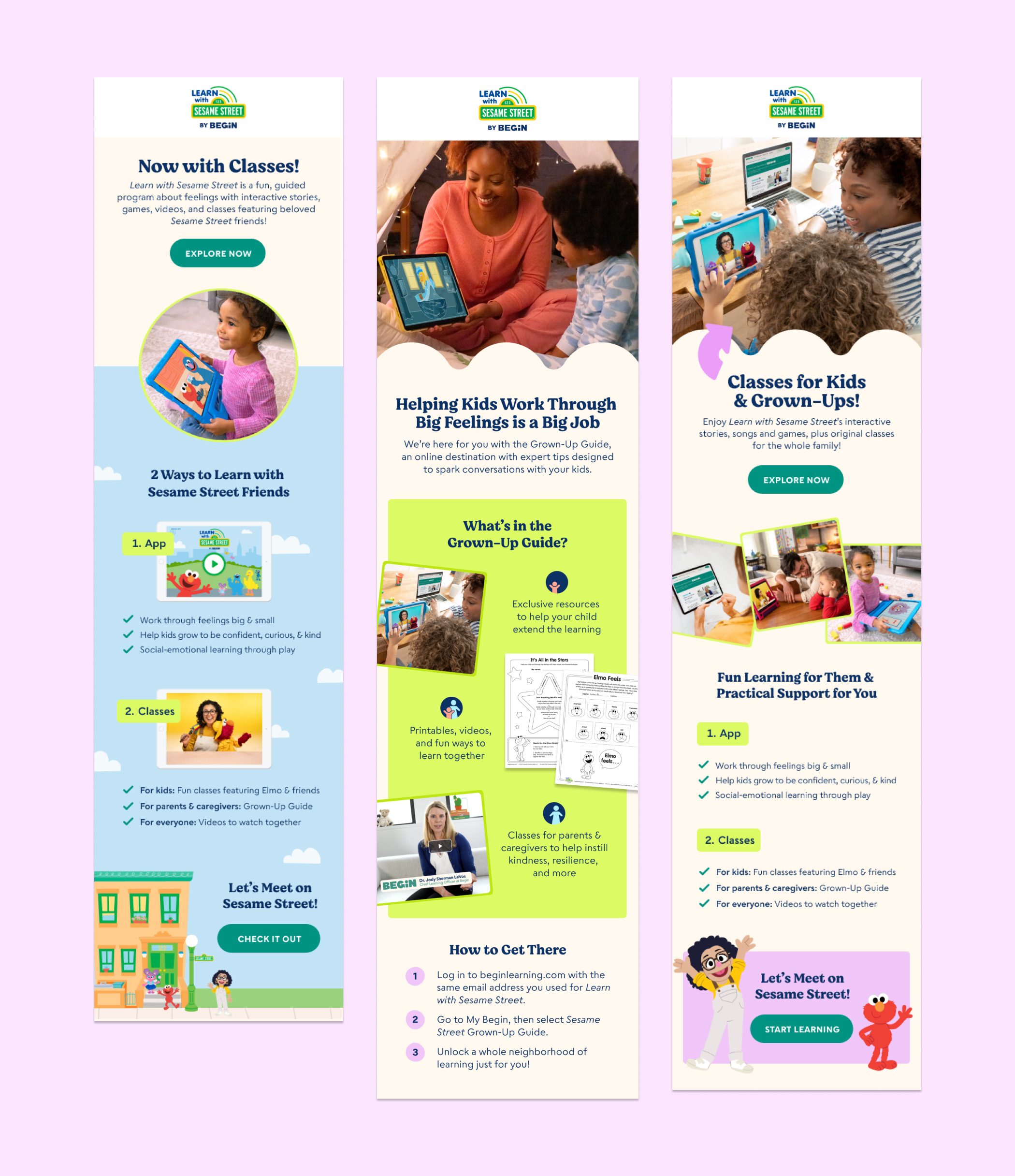 Learn with Sesame Street by Begin helps the youngest learners build strong and healthy emotional foundations to serve them for life. First released as a digital app, LWSS has grown into a multifaceted learning program that includes kid and grown-up classes, a grown-up guide, and hands-on kits and printables.